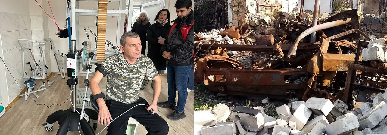 写真左:AARが病院に提供した肩関節の可動域を広げるリハビリ機器(2026年1月、ウクライナ南部ミコライウ州)